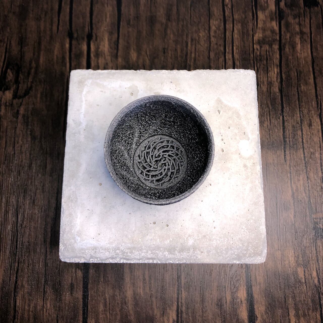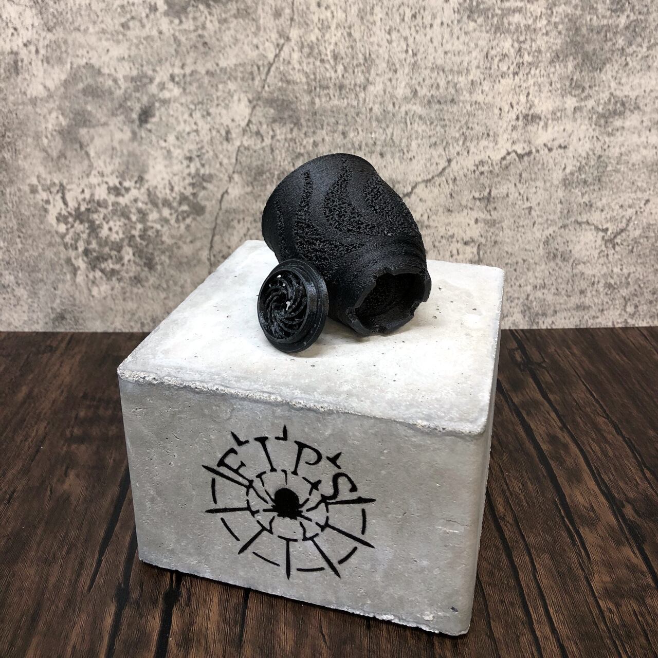 空気が渦を巻いて鉢内に入り込むイメージをそのままに、正面から見た蒸気をイメージしたジャイロイド模様を鉢の淵ギリギリまで伸ばすことで3Dプリンター鉢では難しかった柔軟性も実現させています