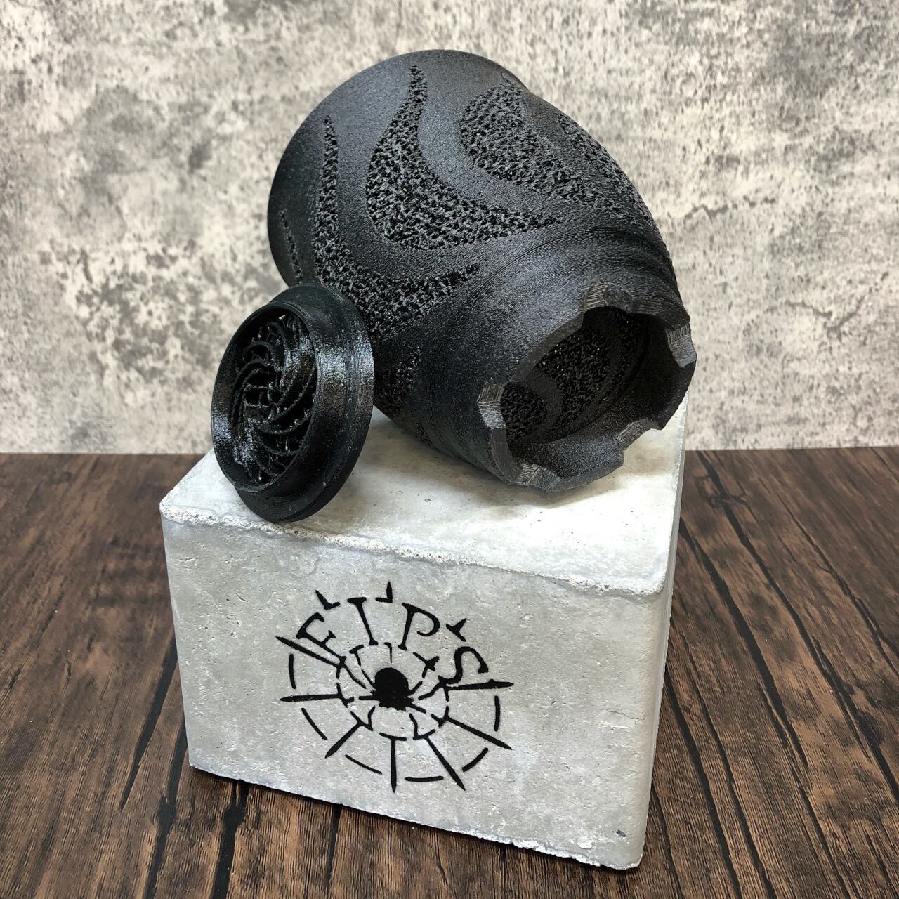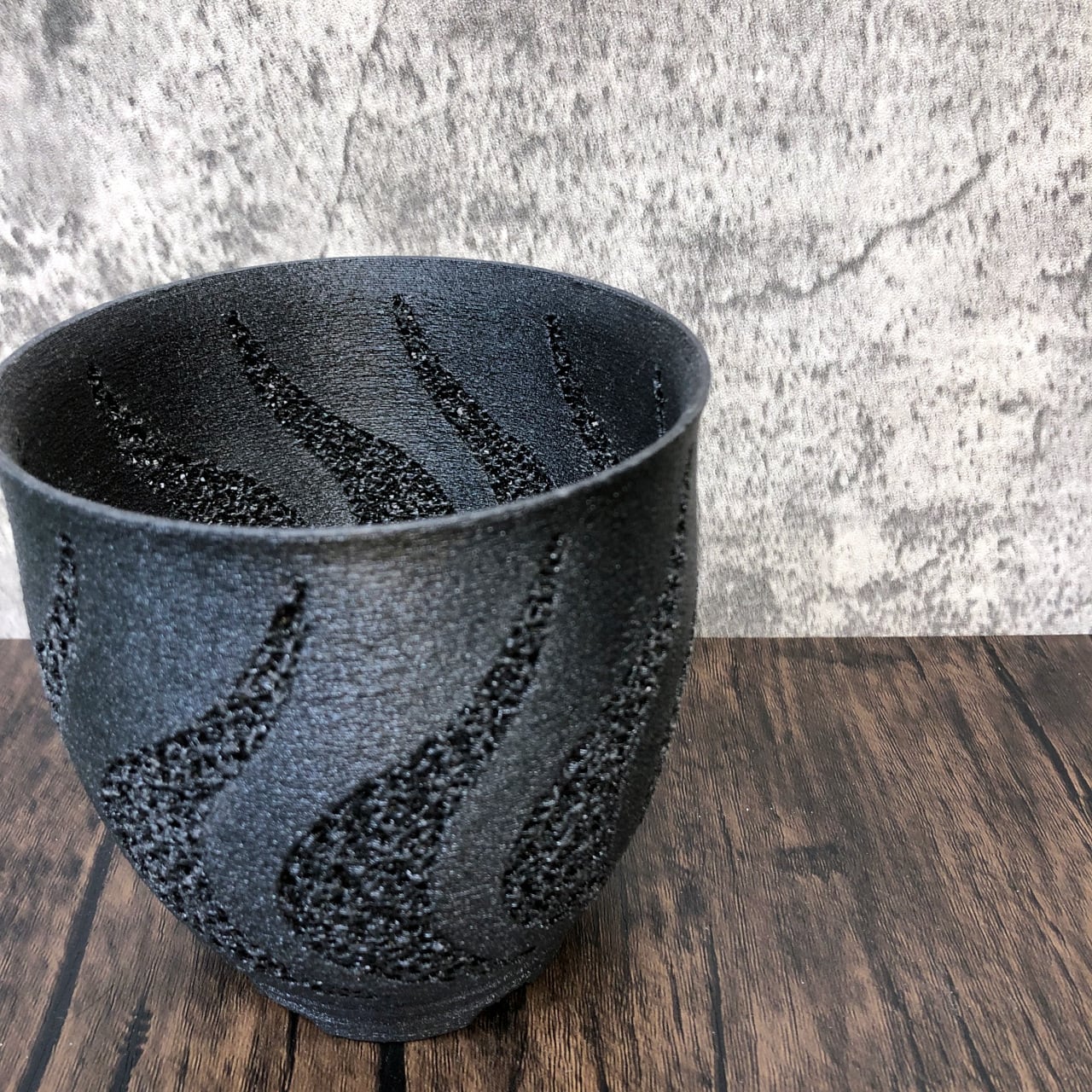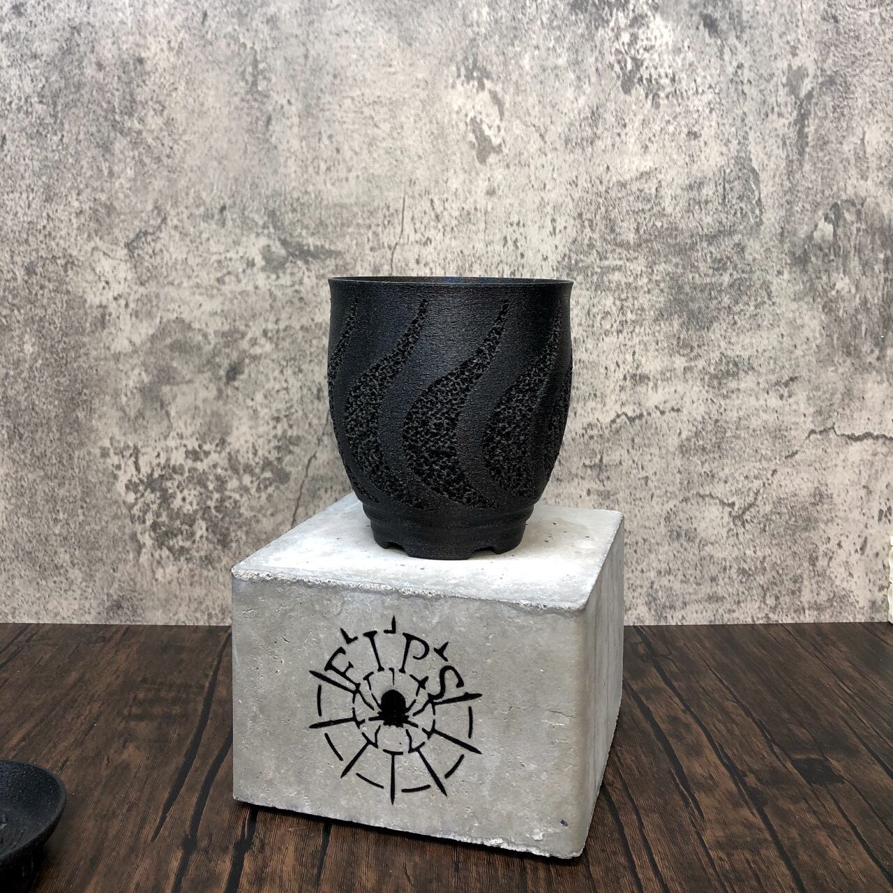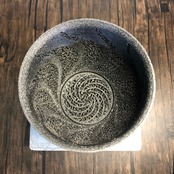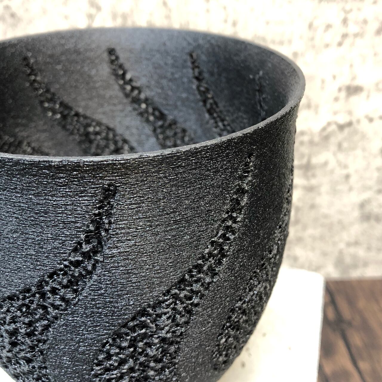 空気が渦を巻いて鉢内に入り込むイメージをそのままに、正面から見た蒸気をイメージしたジャイロイド模様を鉢の淵ギリギリまで伸ばすことで3Dプリンター鉢では難しかった柔軟性も実現させています